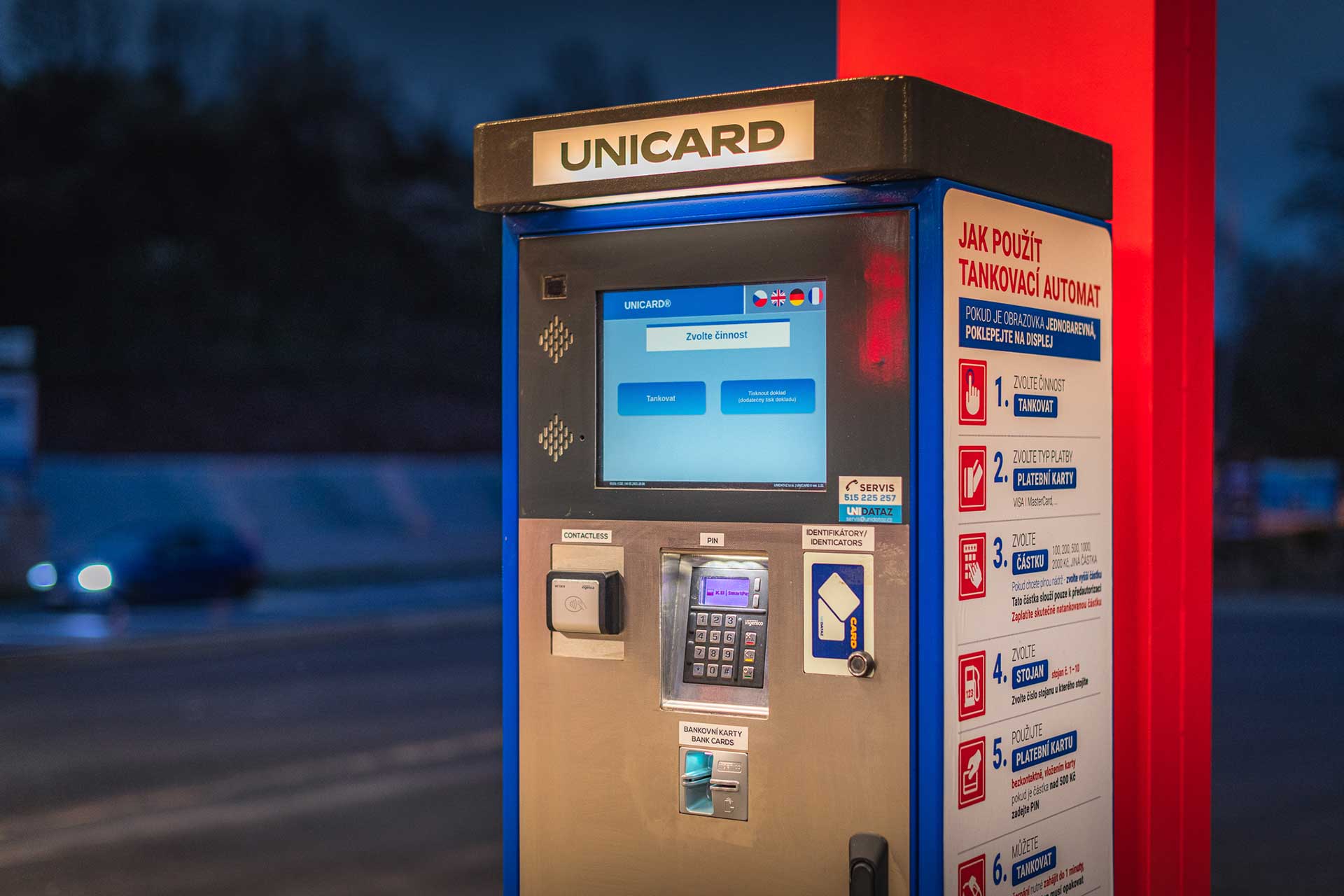V případě použití standardních výdejních stojanů osazujeme čerpací stanice samostatnými terminály řady UNICARD®. Samoobslužné terminály vyrábíme v různých modifikacích. Akceptujeme libovolné identifikační prvky, běžné bankovní karty, fleetové karty a také slevové a věrnostní karty.